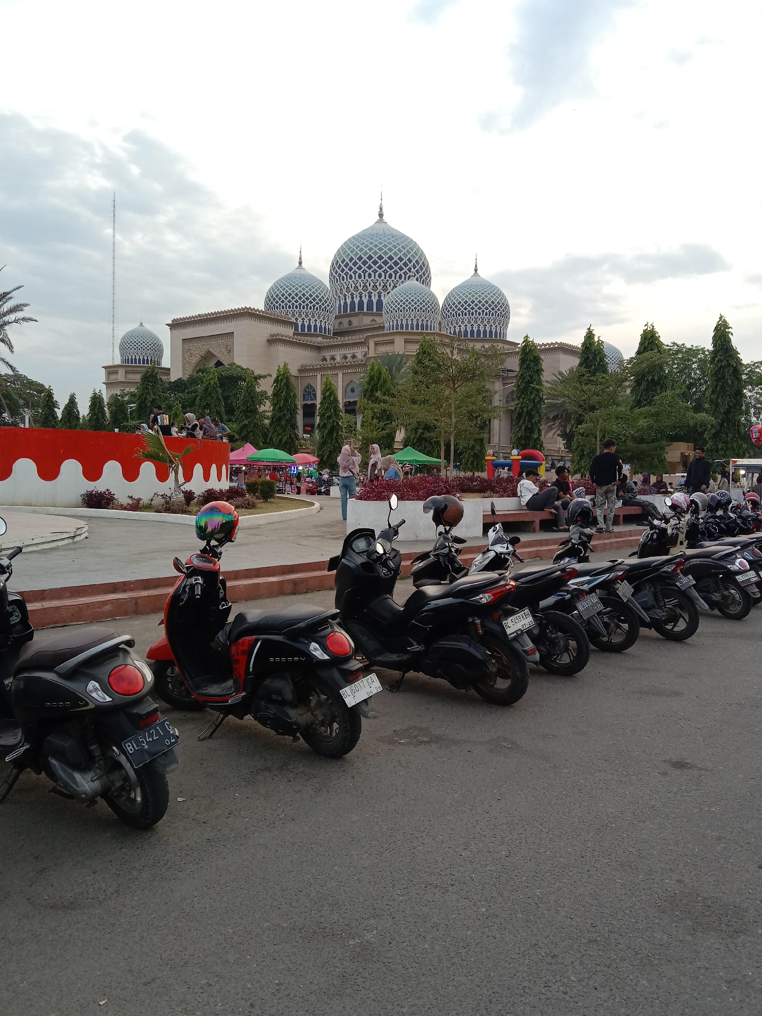 The scene depicts an outdoor public plaza adjacent to the Islamic Center Mosque in Lhokseumawe, Indonesia, under an overcast sky. The mosque, located in the background, is a large building with a light-colored facade, featuring a prominent central dome and multiple smaller domes, all adorned with blue and white geometric patterns. Arched windows and decorative relief work are visible on its structure. A tall, slender communication tower stands to the left of the mosque. Numerous tall, narrow trees and other vegetation are positioned around the mosque and within the plaza. In the midground, a paved plaza contains a curved, low planter wall painted red and white, enclosing shrubs and a small palm. Several temporary market stalls with green and pink canopies are set up, and a red and yellow inflatable bouncy castle is visible. Approximately 20-30 individuals, including adults and children, are present in this area. Some are seated on light-colored benches, while others are standing or walking. Attire is casual, with several women wearing head coverings. The foreground is dominated by a line of approximately 15-20 parked motorcycles, primarily scooters, oriented to the right on an asphalt surface. Vehicle colors include black, dark gray, and red. Helmets are visible on some handlebars or seats; one is multicolored, another is brown. Partially visible Indonesian license plates, such as "BL 5421 G" and "BL 6017 KAF" with numeric dates, indicate registration in Aceh province. The asphalt ground exhibits minor wear. A concrete curb separates the parking area from the plaza. The overall scene portrays a communal gathering in a public urban space.