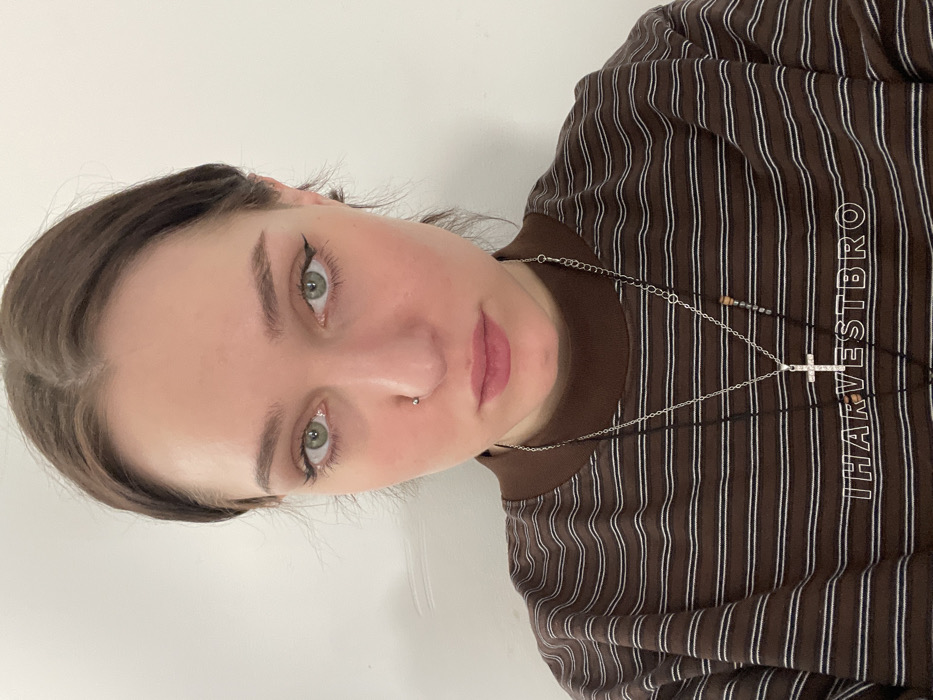 A close-up, head-and-chest portrait of a single female subject is depicted against a plain, light-colored background. The scene takes place in Rostov-on-Don, Russia. The individual, appearing to be a young adult, faces the camera directly with a neutral expression. She has dark brown hair, parted in the middle and pulled back. Her eyes are light green, and she wears black winged eyeliner. A small silver stud piercing is present in her left nostril. Her lips are closed and exhibit a natural pinkish hue. She is wearing a dark brown long-sleeved shirt with thin horizontal white stripes. The visible text on her chest reads "THARVESTBRO" in white letters. Two necklaces are worn: a silver-colored chain with a crystal-encrusted cross pendant, and a longer, thinner black cord necklace adorned with several small dark and light brown beads. The background is an undifferentiated light wall, providing no further environmental context. No discernible actions or interactions beyond posing for the photograph are evident.