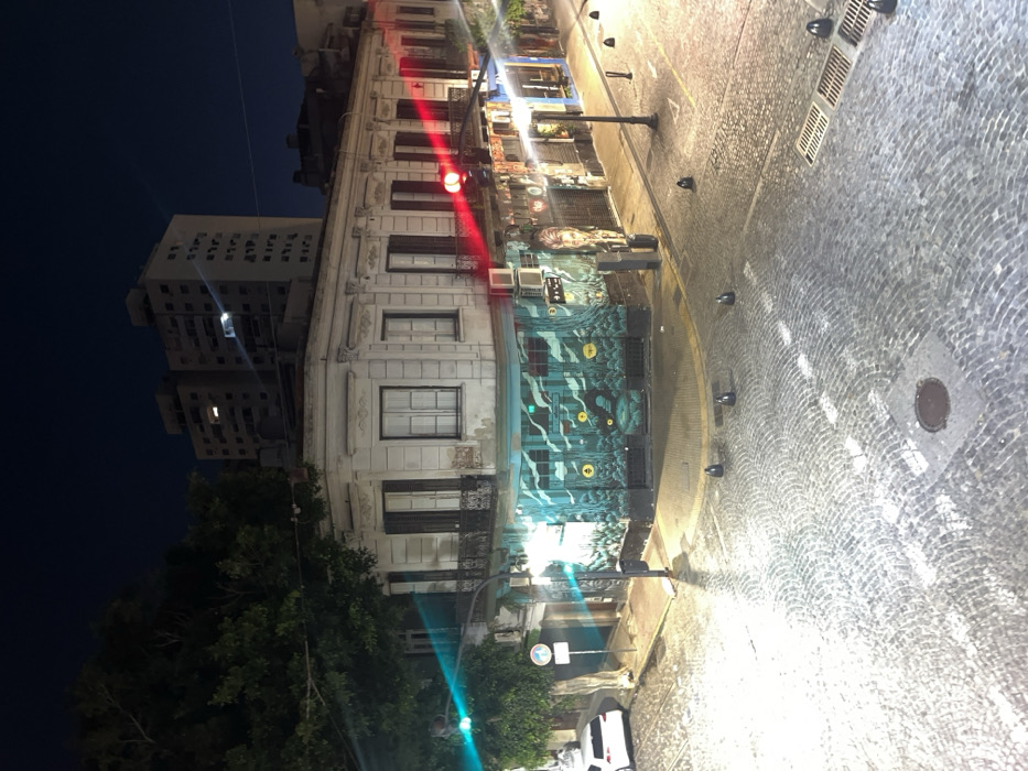A street corner at night features a building with a colorful mural. Streetlights illuminate the scene, casting light on the cobblestone road. A tall building stands in the background, contrasting with the ornate architecture of the corner building. A line of small, dark bollards separates the road from the pedestrian area. A few cars are parked on the street, adding to the urban environment. The scene is a blend of old and new, with art and architecture.