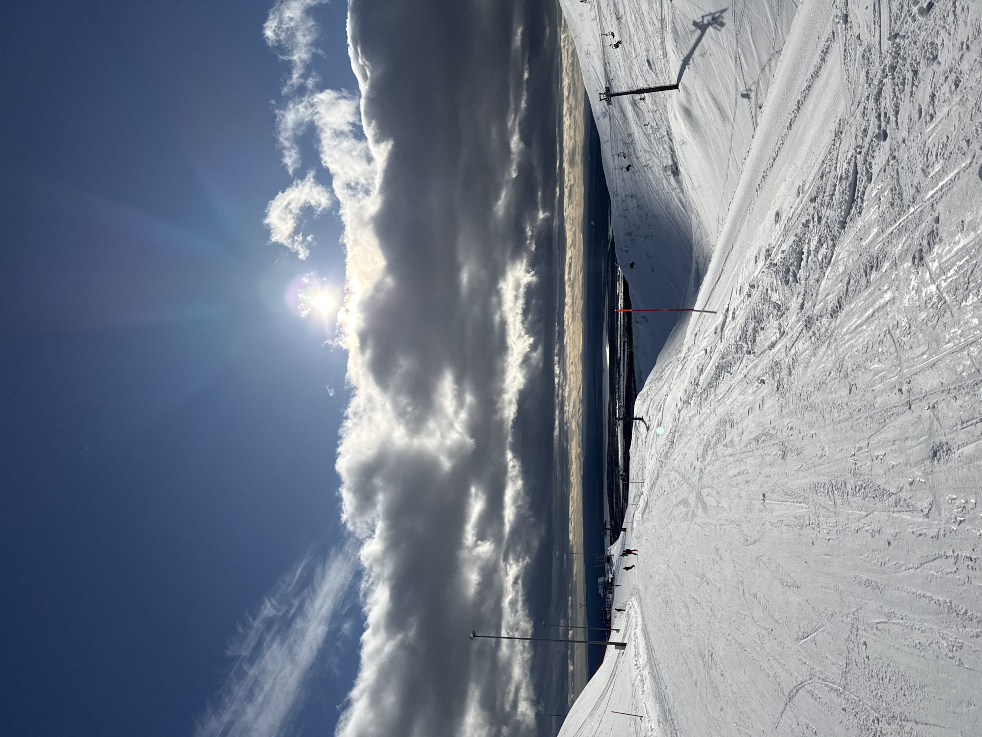 view on a ski slope, located near Kirovsk, Russia. A ski lift is visible to the right, with chairlift supports and cables running up the snow-covered hill. Ski tracks crisscross the slope. In the background, there is a valley with buildings and some trees. The sky above the slope is partly cloudy, with a bright sun partially obscured by the clouds. Some long, thin cirrus clouds are also visible. The sun illuminates the snow-covered ground and the cloud formations.