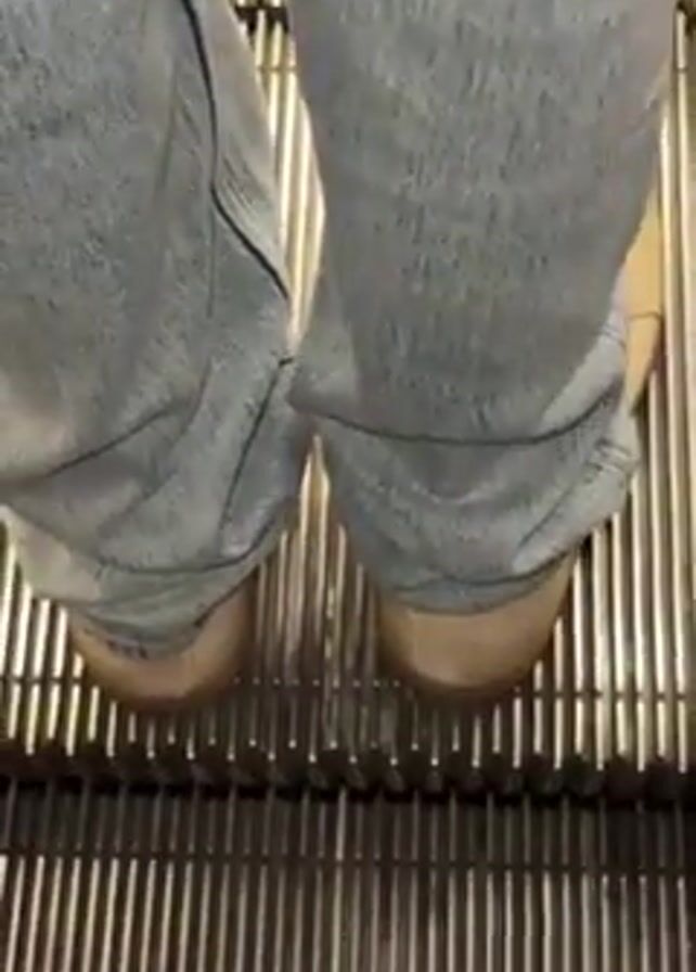 A person wearing light blue denim pants and tan shoes is riding an escalator. The camera focuses on the lower half of the person, capturing the movement of their legs as the escalator goes up. The escalator has a ribbed metal surface.