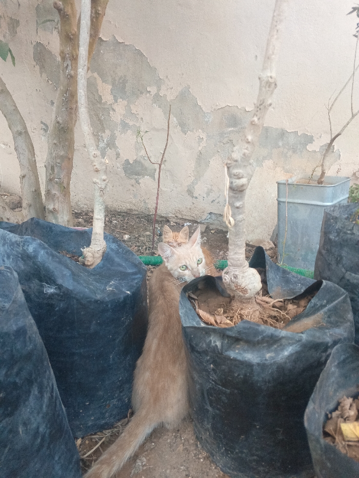 The image depicts an outdoor scene in Al-Kum, Palestinian Territory, featuring two felines amidst a collection of potted plants. A light orange domestic cat with prominent green eyes is positioned centrally, looking directly at the camera. Its body is partially concealed by a large black plastic plant bag containing a tree sapling with exposed roots. Behind this cat's head, the ears and forehead of a second, smaller orange cat are visible. The immediate environment consists of several large black plastic bags, each containing a young tree or plant. Bare tree trunks of various sizes rise from these bags and the surrounding ground. The ground itself is primarily dirt with scattered dry debris and some visible green hose segments in the background. A weathered, light-colored concrete or stucco wall, exhibiting areas of peeling paint or render, forms the backdrop. To the right, a rectangular, unadorned metal container or planter is visible. The scene appears to be a utilitarian outdoor space, possibly a garden or nursery area.