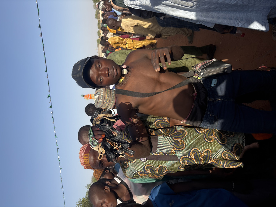 A shirtless man with a black cap is surrounded by a crowd of people under a clear sky. He wears a necklace and a bag slung across his chest. Several people are holding and wearing ornate hats. The crowd is dressed in colorful, patterned clothing and various head coverings. A string of green and white flags is visible in the background.