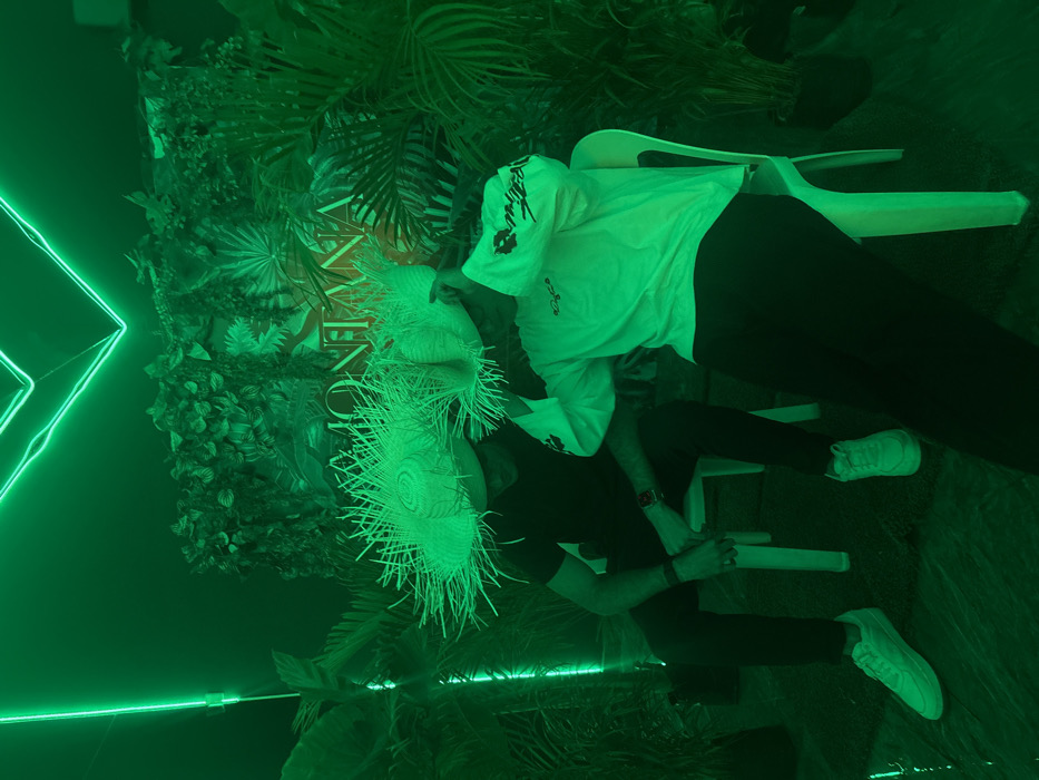 The image depicts an indoor setting in San Bernardino Tlaxcalancingo, Mexico, illuminated predominantly by strong green neon lighting. Two individuals are seated on white plastic chairs on a dark, possibly carpeted, surface. The background consists of a wall covered in artificial green tropical foliage, with the word "MONTANA" visible in light-colored lettering. Above the foliage, green neon light tubes form angular geometric patterns. Potted tropical plants are positioned around the scene. The individual on the left is seated, wearing a dark short-sleeved shirt, dark trousers, and white athletic shoes. A watch is visible on their left wrist. A wide-brimmed straw hat with a frayed, feathery edge completely covers their face. Their hands are clasped in their lap. The individual on the right is also seated, partially obscured. They are wearing a light-colored, long-sleeved shirt with dark graphics on the sleeves and chest, and dark trousers. A similar wide-brimmed, frayed straw hat covers their face. Their right arm is raised, with the hand positioned near the hat, suggesting an adjustment or interaction with the headwear. The pervasive green light casts a monochromatic filter over the entire scene, affecting color perception.