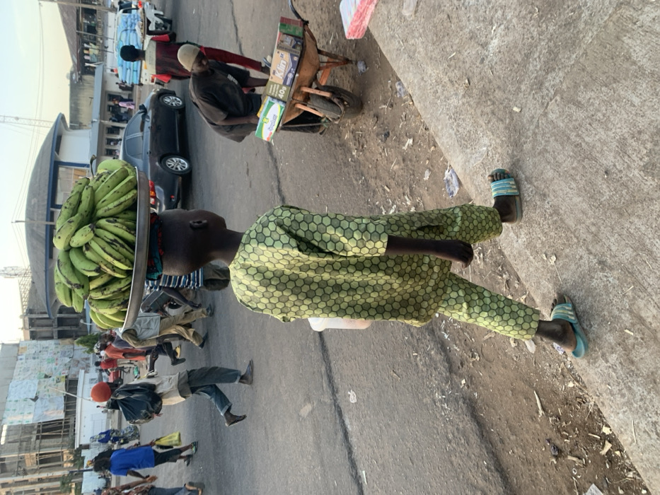 A young person in a green patterned outfit and sandals carries a large tray of green bananas on their head. They stand on a concrete sidewalk next to a street with other people walking. A man wearing a hat is near a small cart loaded with boxes. A black car and other vehicles are visible in the background with buildings and a clear sky.