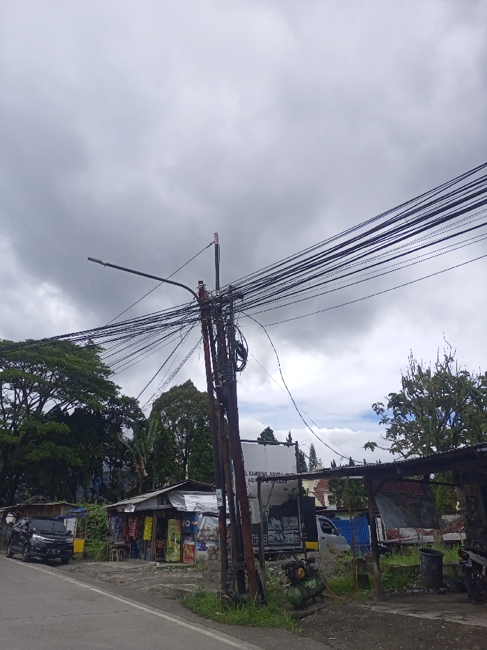 A roadside scene under a cloudy sky. Utility poles laden with tangled wires dominate the view. A small store and a makeshift shop are visible along the road. Cars are parked nearby. Trees frame the background, adding a touch of greenery to the urban landscape. An air compressor sits by the side of the road.