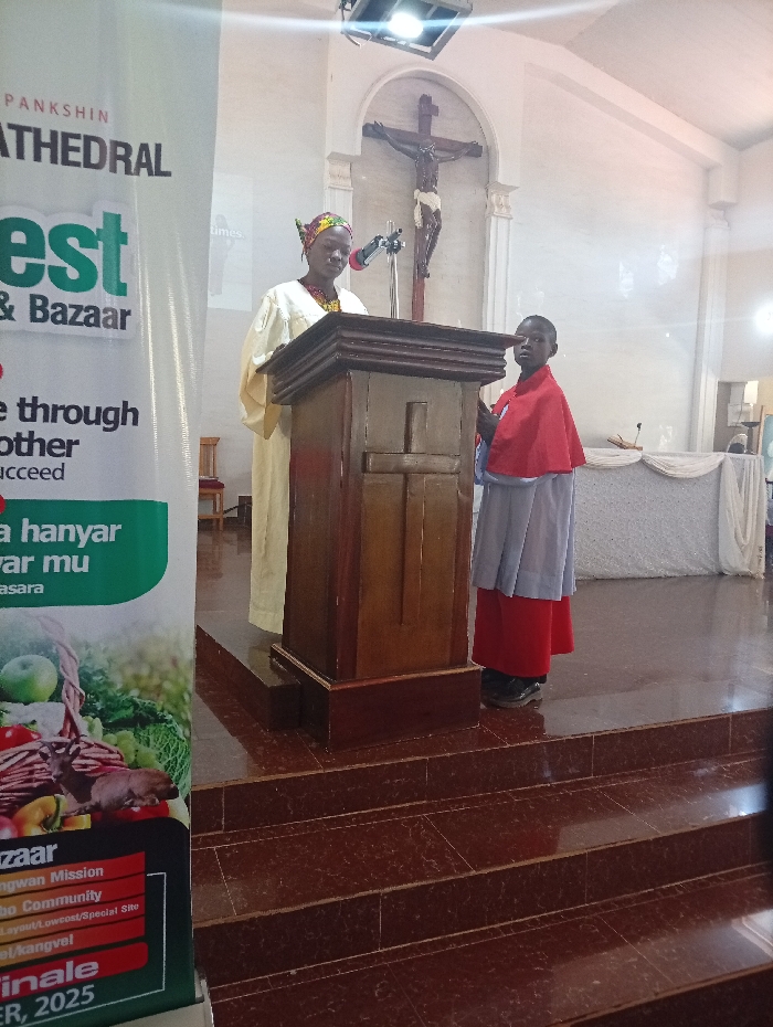 The image displays the interior of Pankshin Cathedral in Pankshin, Nigeria, during an event. An adult female, wearing a light-colored long-sleeved robe and a multi-colored patterned headscarf, stands behind a dark wooden lectern. Her hands are positioned on the lectern's surface, and she appears to be addressing an audience using a silver microphone mounted on a stand. To the immediate right of the lectern, a pre-teen male stands, facing forward, dressed in a grey alb-like garment with a red cape-like overlay. Both individuals are on a raised platform with multiple steps made of polished, reddish-brown tiles. Dominating the background on the altar is a large wooden crucifix depicting Jesus Christ, positioned within a light-colored arched niche. The altar area features light-colored walls, white fluted columns, and a table draped with a white cloth to the right of the crucifix. A tall white banner is partially visible on the far left, displaying green and red text, including "PANKSHIN CATHEDRAL" and "Harvest & Bazaar," accompanied by an illustration of a basket filled with fruits and vegetables. Overhead fluorescent light fixtures illuminate the space. A simple wooden chair is visible in the background against the wall to the left of the crucifix.