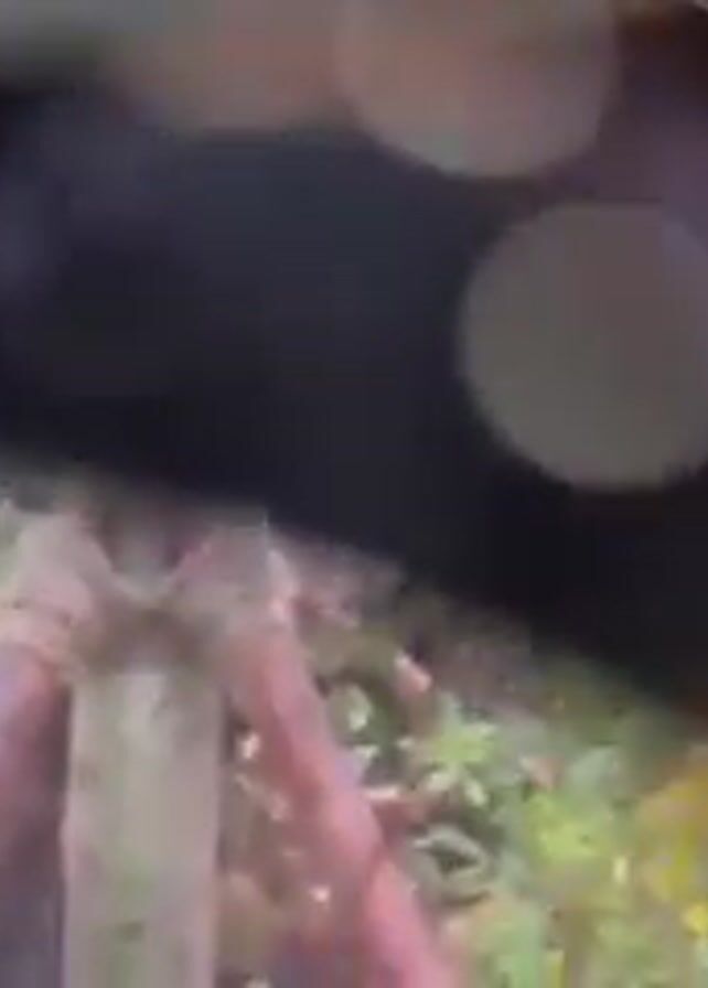 The video appears to be recorded through a scope or lens. Initially, the view is obscured by foliage, with what looks like a white object partially visible in the background. The focus then shifts, blurring the image into an abstract, out-of-focus view.