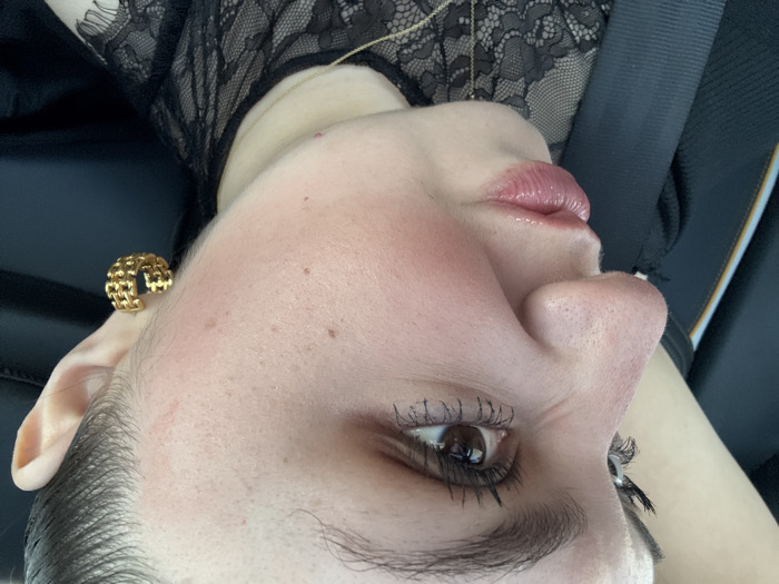 A close-up of a woman's face tilted to the side. She wears a black lace top, a gold chain necklace, and a large gold earring. She has brown eye shadow and mascara on her eye. Her lips are glossy and plump. She appears to be wearing a seatbelt, suggesting she's in a car. The lighting highlights her skin texture and makeup.