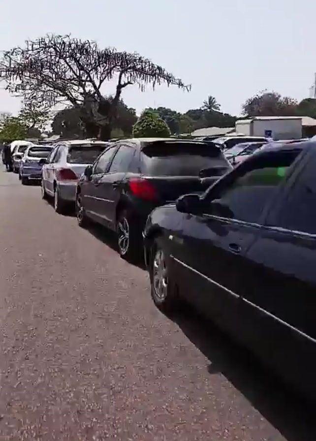 street lined with parked cars. The camera moves along the street, showing a variety of vehicles, including sedans and hatchbacks, in different colors. One person is seen working on the engine of a silver hatchback with the hood open. Another person walks along the sidewalk next to the parked cars. The setting appears to be outdoors on a sunny day, with trees visible in the background.