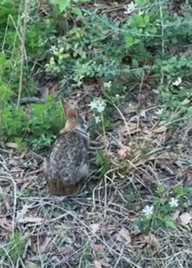 small, mottled brown rabbit sitting in a patch of vegetation and dry leaves. The rabbit is facing away from the camera at a slight angle, and is eating a white flower. There are various green plants and dried grasses around the rabbit. In the background, voices are heard, including a child saying "bunny". The camera seems to be held at a distance, providing a clear but not zoomed-in view of the scene.