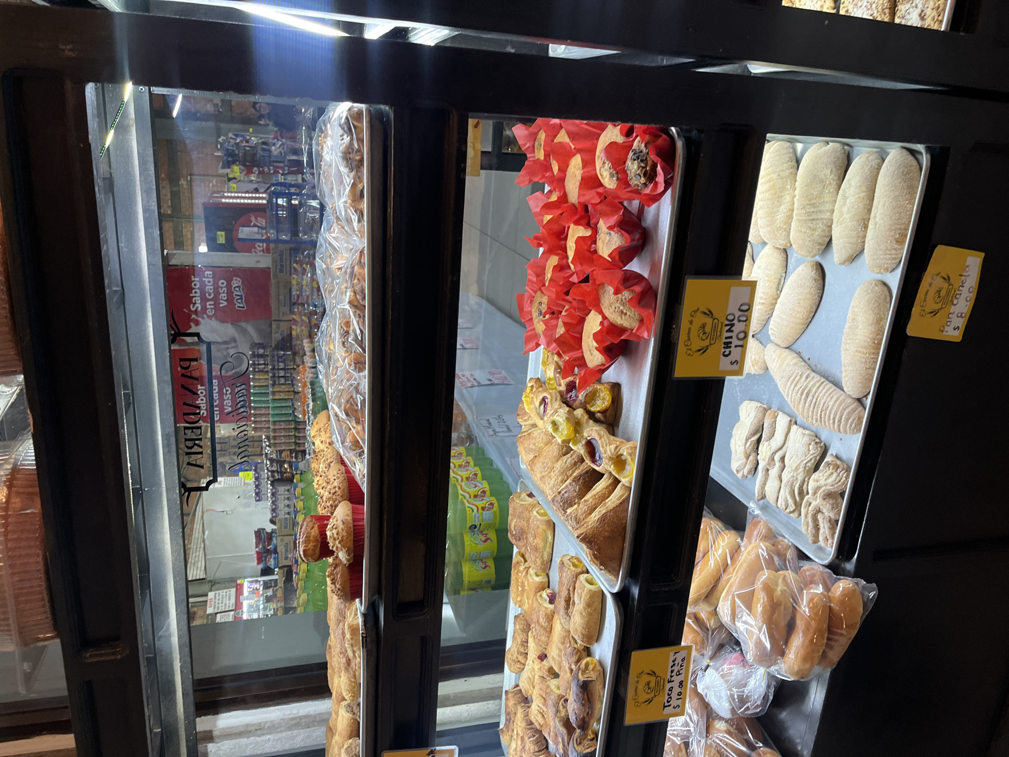 A bakery display case in Cholula, Mexico, showcases various pastries. The leftmost section features assorted breads, followed by muffins in red paper cups and pastries with fruit fillings. The next section presents a tray of "Chino" bread ($10.00), along with "Pan Canela" ($8.00). The bottom right contains baguettes. The display reflects a commercial environment, with pricing signs and typical Mexican pan dulce offerings. Through the glass, shelves of supermarket goods are visible.