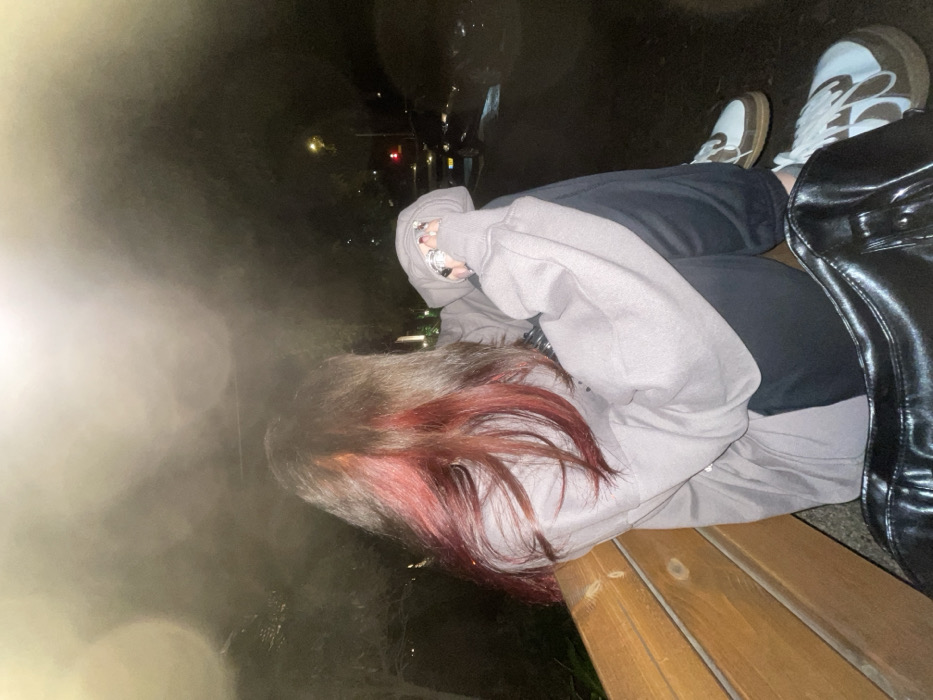 A person reclines on a wooden bench, head resting at one end. They wear a grey hooded sweatshirt with the hood up and black pants. Their hair is brown with red highlights. White sneakers are visible. A black leather jacket sits to the side. The scene is dark, possibly at night, with some light sources in the background and a hazy or foggy effect in the foreground.