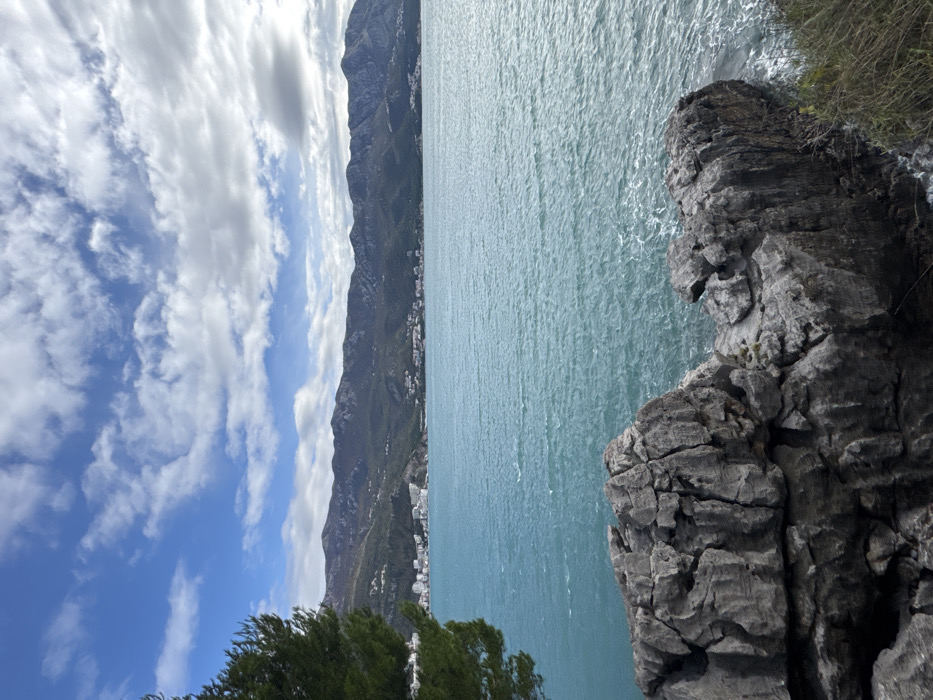 The image displays a coastal landscape in Budva, Montenegro, viewed from a rocky elevation. In the foreground, large, fractured dark grey rock formations occupy the lower half of the frame, extending from the left edge towards the lower right. Sparse green vegetation is visible on the far right edge of these rocks. A section of a green pine tree is visible along the upper left margin of the image. The midground features a body of teal-colored water exhibiting ripples and small waves. Across this water, clusters of white and light-colored buildings are visible along the distant coastline, indicating a settlement. A range of dark green, rugged mountains forms the background, stretching horizontally behind the coastal settlement. The sky above is a mix of clear blue and scattered white cumulus clouds. No individuals or direct interactions are visible.