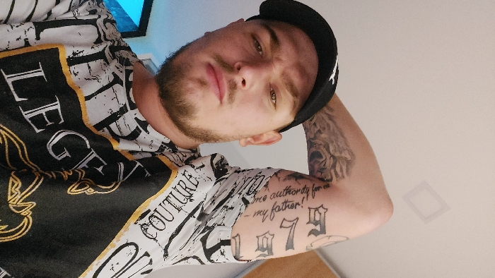 Senec, Slovakia. A close-up, low-angle portrait features a light-skinned adult male looking directly forward. He has a trimmed brown beard and mustache and wears a black baseball cap with a white emblem, and a short-sleeved t-shirt with a white, black, and gold pattern including the words "LEGEND" and "COUTURE." His right arm is bent and raised, displaying multiple tattoos: a detailed design on the upper arm, script text on the inner bicep reading "I have no authority for my father!", and stylized gothic lettering further down. The background is a plain light-colored wall with a faint square ceiling light fixture on the upper right and a blurry blue light source visible on the lower left.