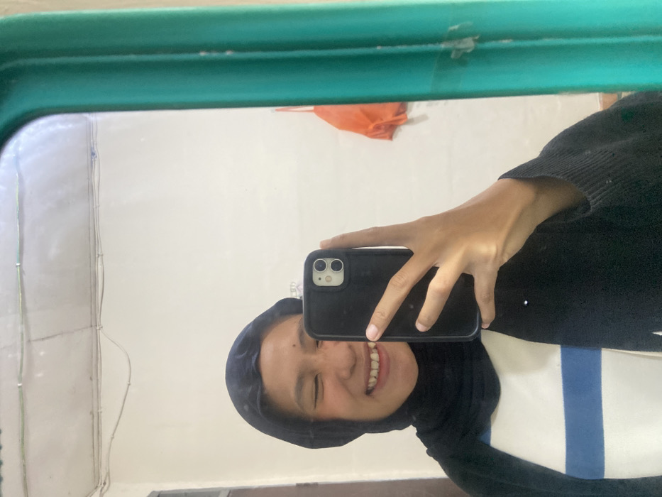 A person takes a selfie in a mirror with a green frame. The person is wearing a hijab and a black cardigan with a white and blue striped shirt underneath. They are holding a black smartphone. An orange cloth is visible hanging on the wall. The wall is white with some electrical cords.