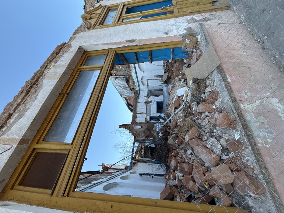 - "The scene depicts the severely damaged interior of a building located in Pirot, Serbia, viewed through a large, prominent yellow wooden window or door frame from the exterior" by FM-PD7Ls2, licensed under CC BY 4.0