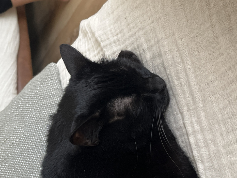 - "A black domestic cat is depicted sleeping on a light-colored, textured fabric surface, likely in an indoor residential setting within Ras Al-Khaimah, United Arab Emirates" by FM-leUqa2, licensed under CC BY 4.0