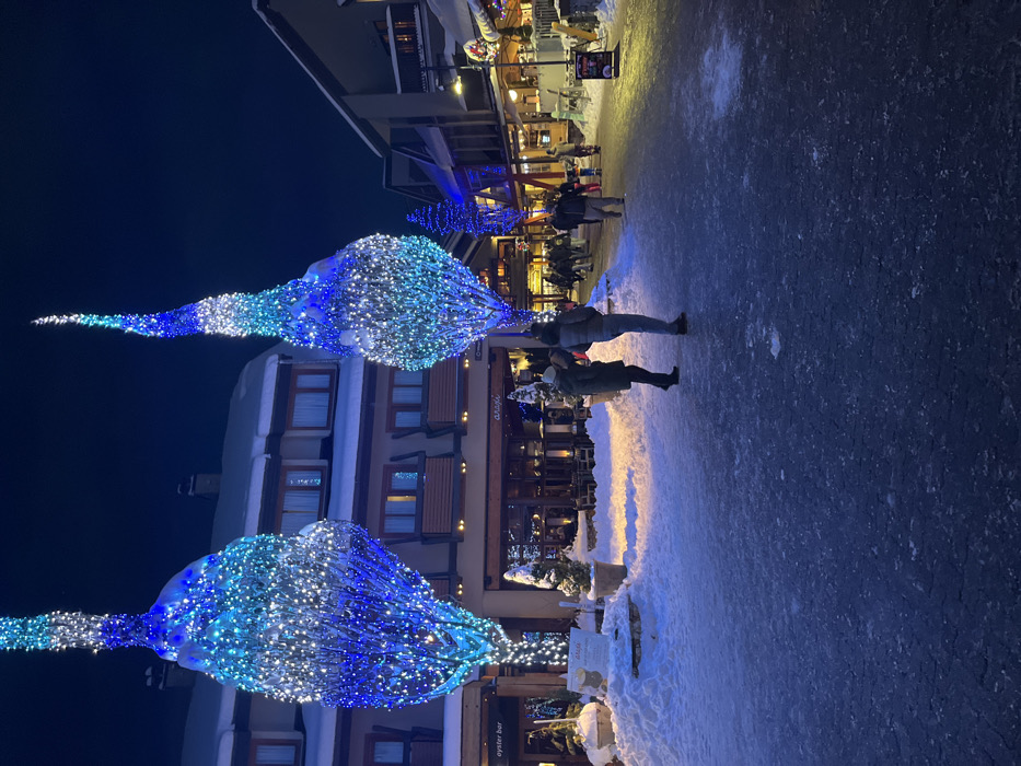 A nighttime scene shows a snow-covered street in a village with illuminated decorations. Two large blue and white light displays shaped like icicles hang from buildings. Pedestrians stroll along the icy street. A restaurant with outdoor seating and warm interior lighting is visible. The sky is a deep blue, suggesting early evening. The scene conveys a festive, wintery atmosphere.