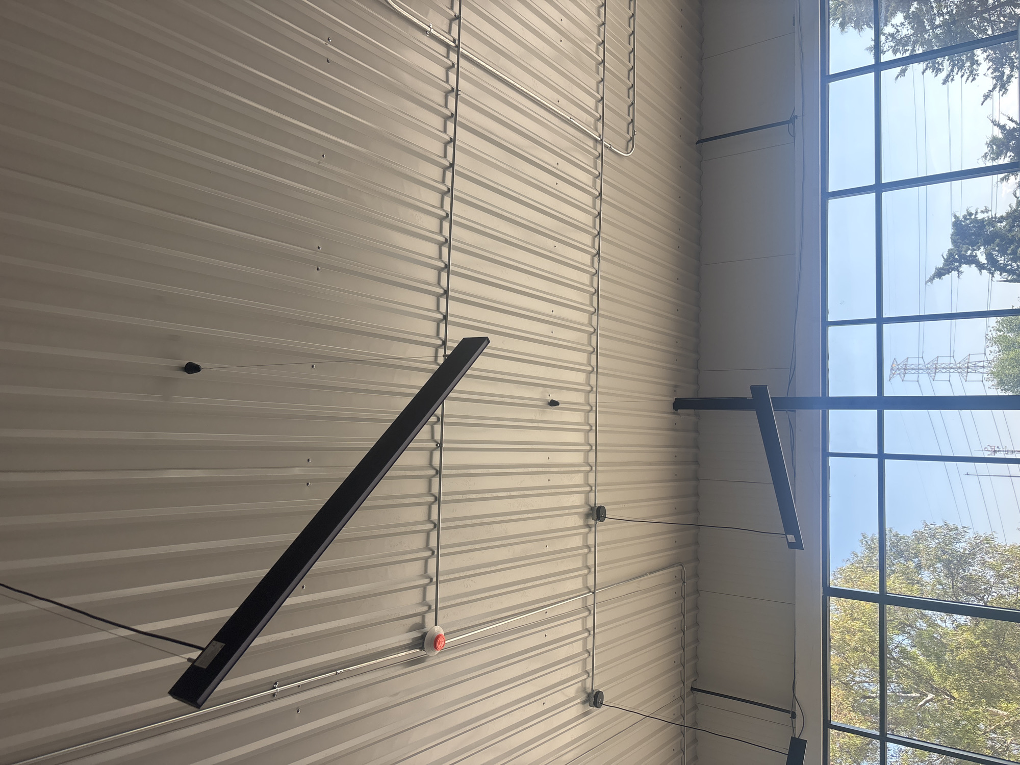 The scene depicts the interior upper section of a building in Buenavista, Mexico, looking towards the ceiling and through an exterior window wall. The ceiling consists of light grey corrugated metal panels, secured by visible fasteners. Multiple black linear light fixtures are suspended from the ceiling via wires, with one positioned diagonally in the upper-left foreground and another towards the right. Silver-colored electrical conduit runs across the ceiling, to which a red and white smoke detector is affixed in the upper left quadrant. Below the corrugated ceiling is a light-colored flat wall section, transitioning to a multi-pane window system with dark frames. Through the windows, a clear blue sky is visible. The exterior environment includes various trees with light green and dark green foliage, and in the mid-ground, a large, lattice-structured electrical transmission tower is discernible against the sky, accompanied by overhead power lines. No individuals are present in the image.