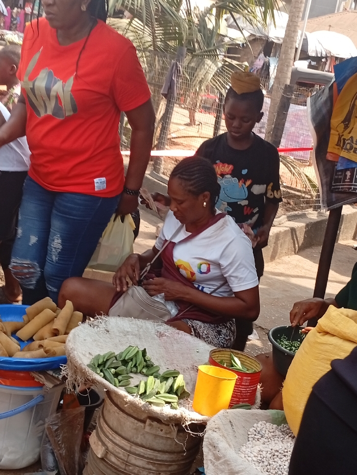 The scene depicts an outdoor market stall in Nkwelle, Nigeria, under bright daylight