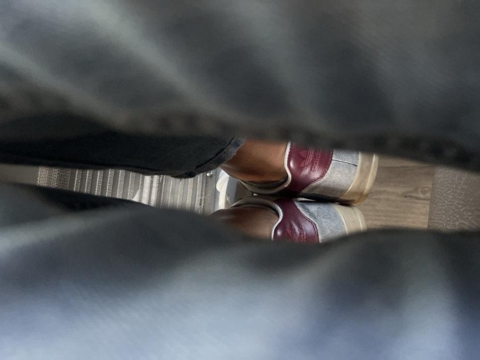 - "This interior image, captured in Pombal, Portugal, depicts a low-angle view between two light-colored trouser legs" by FM-t80Kg1, licensed under CC BY 4.0