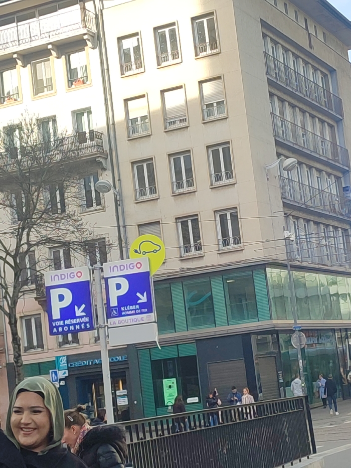 This image depicts a daytime street scene in Strasbourg, France, specifically near the Place de l'Homme de Fer and Place Kléber, indicated by prominent parking signs. In the foreground, a black metal railing runs horizontally, behind which pedestrians are visible. On the far left, partially in view, is a smiling woman with light skin, dark hair, and a light green hijab, looking towards the right of the frame. Behind her, another woman with light skin and a dark jacket is partially visible. Further to the right, several indistinct figures walk along a sidewalk. Dominating the mid-ground are two multi-story buildings and street signage. On the left, a light-colored building features multiple windows, some with external shutters, and balconies with intricate iron railings. A bare deciduous tree stands in front of this building. On the ground floor of this section, a "Crédit Agricole" bank branch is partially visible. To the right, a taller, beige-colored corner building rises, featuring numerous rectangular windows, many equipped with external rolling shutters. The upper floors have continuous balconies with modern metal railings. The ground floor of this building is a commercial space with large, reflective, green-tinted windows and dark facade elements. In front of the corner building, two blue "INDIGO P" parking signs are mounted on a pole. The left sign reads "VOIE RÉSERVÉE ABONNÉS" (Reserved Lane Subscribers) with a downward arrow. The right sign also has a downward arrow and reads "KLÉBER HOMME DE FER" with a wheelchair accessibility symbol, and "LA BOUTIQUE." A circular yellow sign with a green electric car charging symbol is affixed to the building above these signs. The scene is brightly lit by natural sunlight, casting some shadows and highlighting the facial features of the woman in the foreground. A street light pole is visible between the two main buildings.