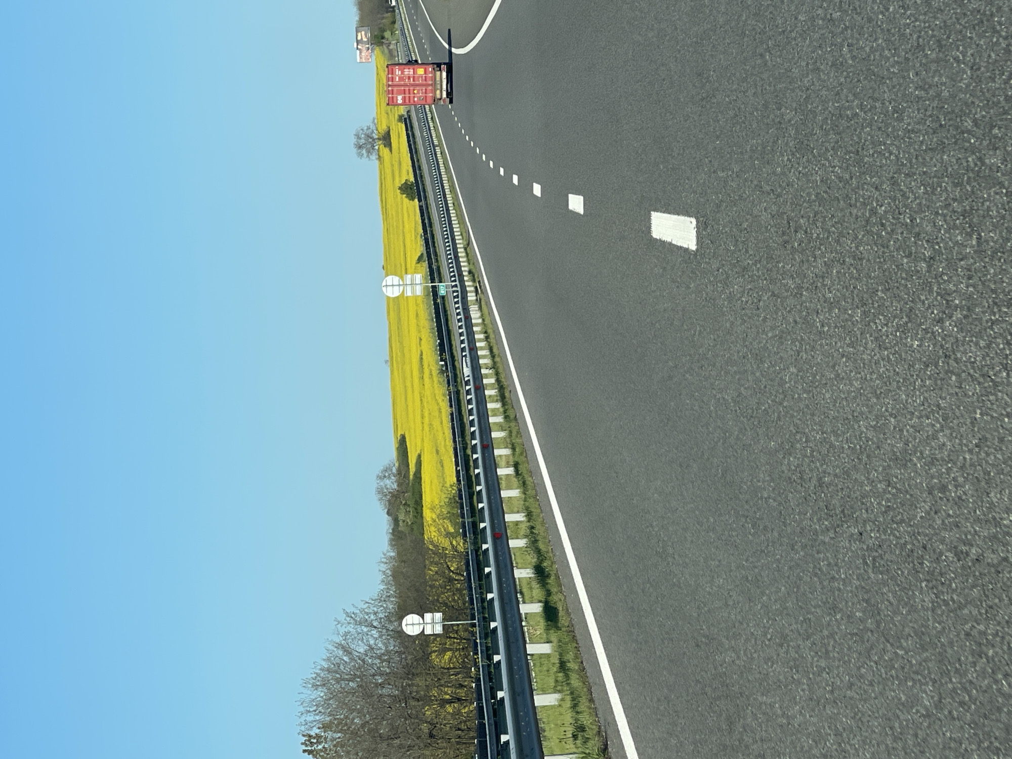 highway in Zheleznik, Bulgaria. A red semi-trailer truck is driving on the highway. To the left of the highway is a field of yellow flowers and trees. The sky is blue. A highway sign is visible.