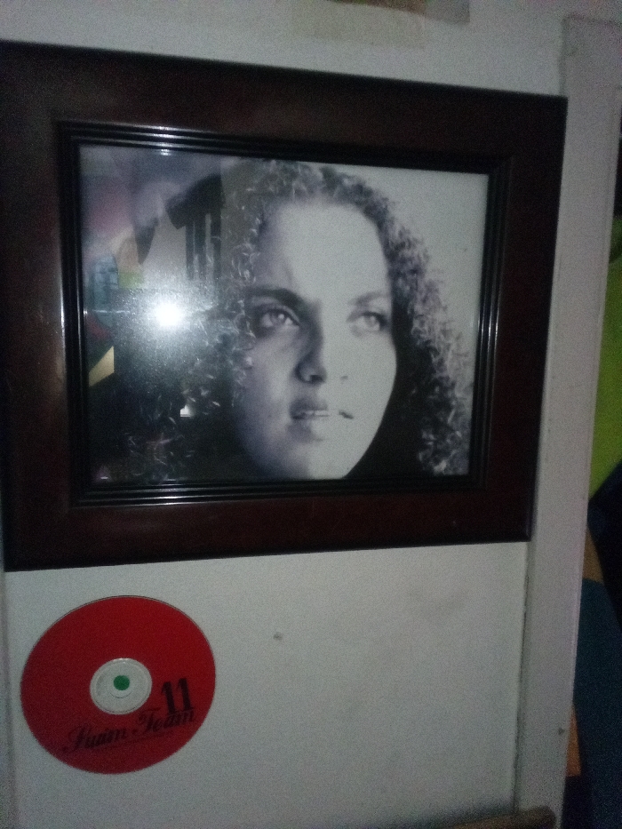 This image depicts an indoor scene in Los Angeles, United States, showcasing a wall with two affixed items. Centrally located and occupying the upper portion of the frame is a rectangular, dark brown wooden picture frame, approximately 18x14 inches. Inside the frame is a black and white portrait photograph of a woman with dark, curly hair, looking upwards and to her right, with a serious or contemplative expression. Her gaze appears to be directed off-camera. Significant glare and reflections are present on the glass covering the photograph, obscuring parts of her face and showing indistinct colorful shapes from the surrounding room environment. Below the framed photograph, affixed to the light-colored wall, is a circular red disc, resembling an optical disc like a CD or DVD. White text on the disc reads "11" and "Swim Team." The wall itself is a plain, light color, likely white or off-white. No people are actively visible or interacting in the immediate scene; only their likeness in the photograph and their implied presence through the decorated wall are evident.