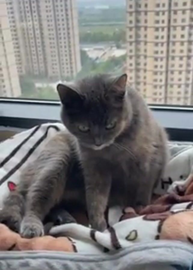 A medium shot shows a gray cat sitting in a patterned cat bed with a city backdrop seen through a window