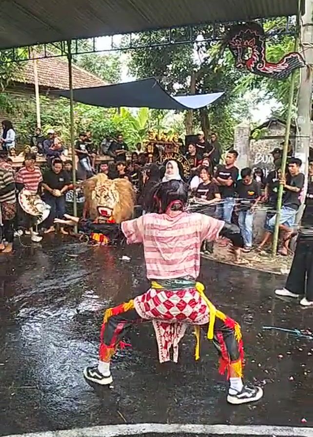 A man in a traditional costume performs a dance outside on a wet, paved surface. He is bent over backward with his hands on the ground, moving his legs in a rhythmic fashion. A crowd of people surrounds the performance area, watching. There is a building with a corrugated metal roof and bamboo supports behind the crowd. There are also trees and other greenery visible in the background.