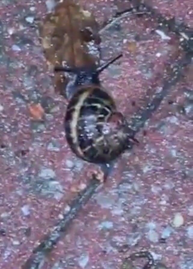 snail moving across a damp brick surface. The snail is dark in color with a yellowish stripe on its shell. There are small twigs and a leaf nearby. The video is shot from a close, top-down perspective. A voice can be heard saying, "Hey buddy, hurry up, it's getting late to get home."