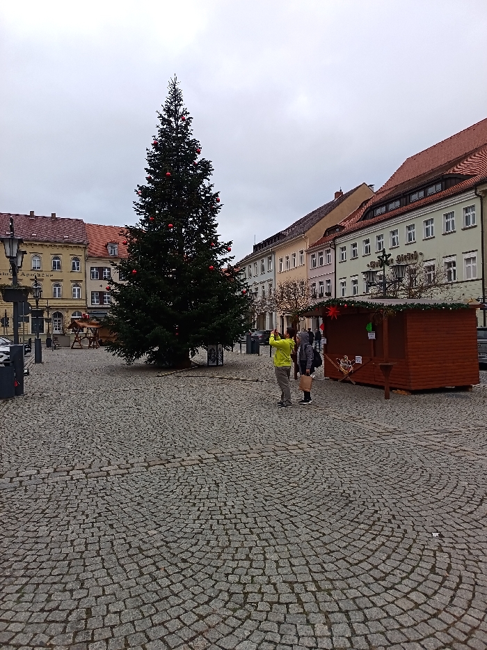 The image displays an outdoor public square in Kamenz - Kamjenc, Germany, under an overcast sky. The ground is paved with grey cobblestones arranged in concentric or fan-shaped patterns. A large, conical evergreen Christmas tree, decorated with numerous red spherical ornaments, stands prominently in the center of the square. Its base is obscured by a dark, square-framed enclosure. To the right of the Christmas tree, a brown wooden market stall with a sloped roof is visible. It is adorned with a string of green garland and a red star ornament on its front facade, appearing unoccupied. Two individuals are present on the cobblestones to the right of the Christmas tree. The person on the left wears a bright yellow-green jacket and light-colored pants, holding a mobile device up to eye level, seemingly photographing the scene. The second individual, positioned slightly behind and to the right, wears a dark hooded jacket and dark pants, holding a white bag in their left hand. Both individuals face generally towards the market stall and the background buildings. The square is bordered by multi-story buildings with pitched, reddish-brown tiled roofs. The building facades exhibit varied pastel colors, including yellow, cream, and light green, featuring multiple windows with white frames. A partial sign displaying "KÖNIGLICHE APOTHEKE" is discernible on a yellow building in the left background. An ornate dark lamppost with two luminaires is visible on the far left, along with sections of parked vehicles and a wooden structure, possibly playground equipment or another stall, further in the background.