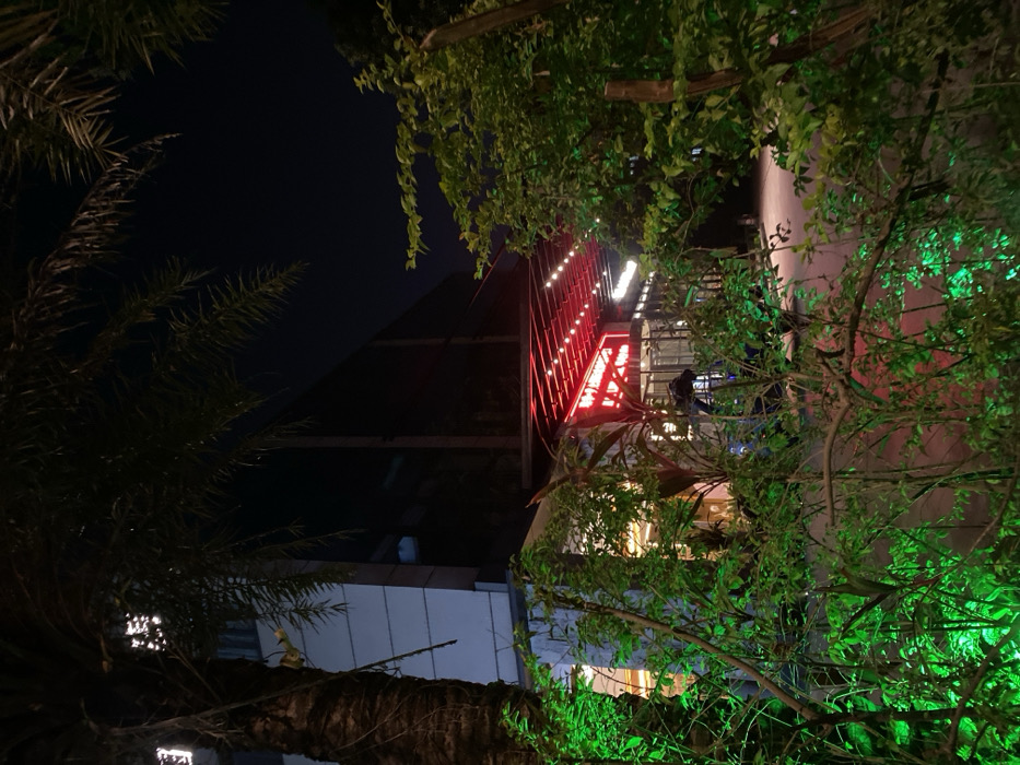 The scene depicts a building entrance at night, located in the Huangpu District, China. The foreground is dominated by lush green foliage, including a prominent palm tree trunk on the left. These plants are intensely illuminated from below by green spotlights. In the midground, a commercial building entrance is visible through the dense vegetation. A bright red neon sign, partially obscured by branches, is mounted above the entrance, displaying indistinct text. A dark, slatted awning or canopy extends over the entrance, adorned with multiple rows of warm white string lights. The entrance itself features glass walls and what appears to be a revolving glass door. A dark, upright, indistinct shape or object is positioned directly in front of the revolving door. The background reveals a multi-story building. Its upper-left section consists of light-colored panels, receiving moderate illumination, while the rest of the building appears dark. The sky above is dark, consistent with a nighttime setting. No specific individuals are clearly identifiable; however, faint, dark, indistinct shapes are present near the building entrance. No discernible actions or interactions are occurring.