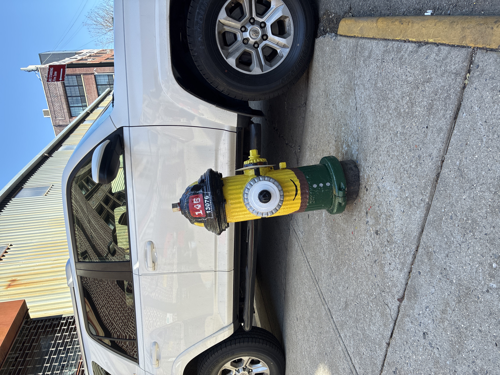 The image displays a street scene in New York, United States of America. In the foreground, on a concrete sidewalk, a fire hydrant is present. The hydrant is painted black on top, yellow in the middle, and green at the base, and has been modified to resemble a character with a large googly-eye and a painted smile. The black top features white text: "146" within a red square, and "13076" below it, enclosed by a dashed white line. Behind the fire hydrant, a white SUV, identified as a Toyota 4Runner, is parked parallel to the curb, with its driver's side visible. Its windows reflect sections of brick buildings. In the background, to the left, a building with a corrugated metal facade and a partially visible security gate stands. Further back and to the right, a red brick building with multiple windows is visible. Above this brick building, a red rectangular sign with white text reads "NO STANDING Fire Zone" and includes a left-pointing arrow. The sidewalk features expansion joints and minor imperfections. A yellow-painted curb is visible along the right edge of the sidewalk. The scene is illuminated by bright natural daylight.