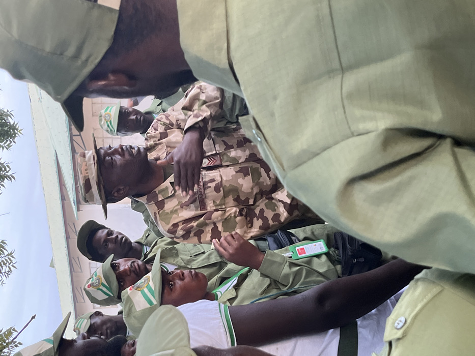 A group of people in military or paramilitary uniforms gather. An officer in camouflage places his hand over his heart. Those around him are mostly in green uniforms with hats trimmed in white and green. The scene appears outdoors, possibly a training or ceremony. The uniforms suggest a formal or official function.
