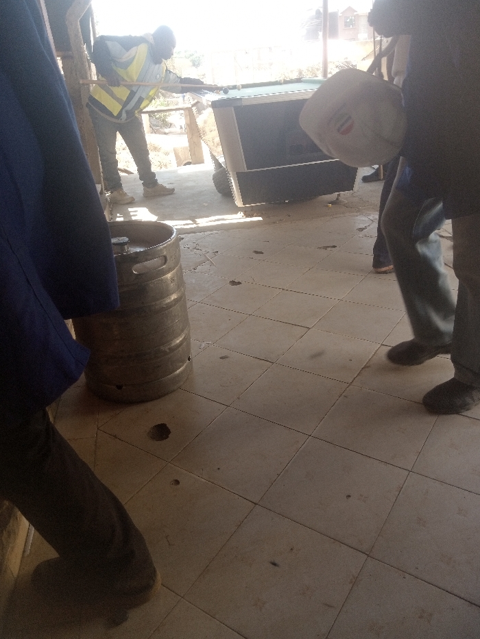 The scene depicts a semi-enclosed, tiled outdoor or patio area in Kitui, Kenya, under bright daylight. The floor is composed of light-colored square tiles, some exhibiting minor dark spots and small circular depressions. In the left foreground, a silver-colored metallic beer keg stands upright. A person, partially visible on the far left, wears dark trousers and a blue garment. In the mid-ground, a male individual wears a yellow and black high-visibility vest over a dark shirt and light trousers; he is actively engaged in playing billiards on a dark-framed pool table with a green felt surface, holding a cue stick. Another person, partially visible on the right, wears dark trousers and holds a white hard hat with a red marking. The legs of an additional individual are partially visible in the right background.