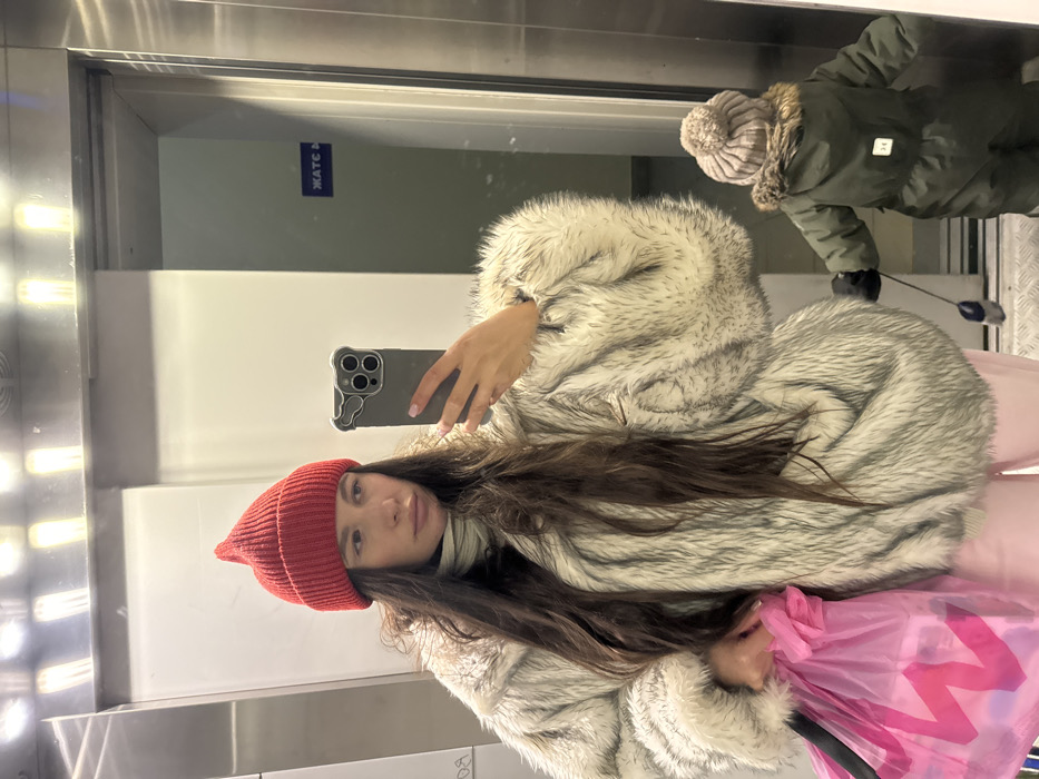 A woman takes a mirror selfie in an elevator. She is wearing a red beanie and a large fur coat. She holds a pink bag in one hand and a smartphone in the other. Reflected in the mirror is a small child in a snowsuit, seen from the back. An elevator sign is visible on the back wall. The elevator interior is gray and metallic.
