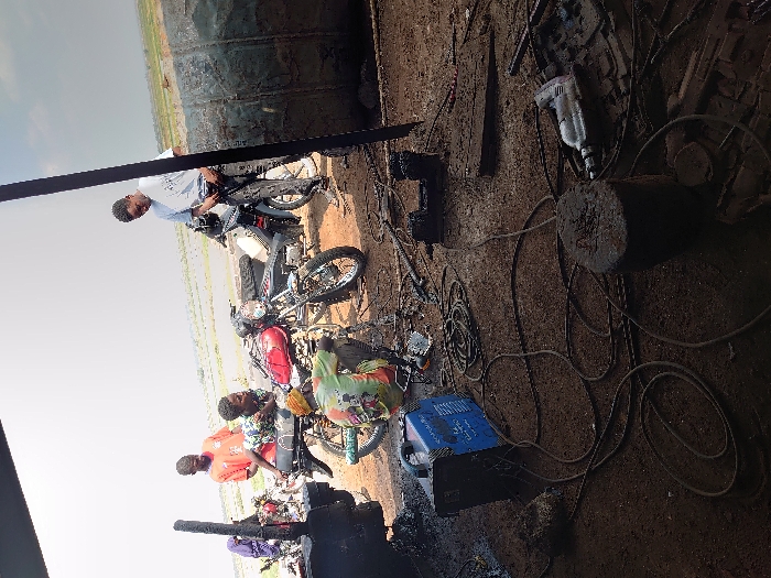 The scene depicts an outdoor repair area in Adankolo, Nigeria, with a dirt ground and an open sky