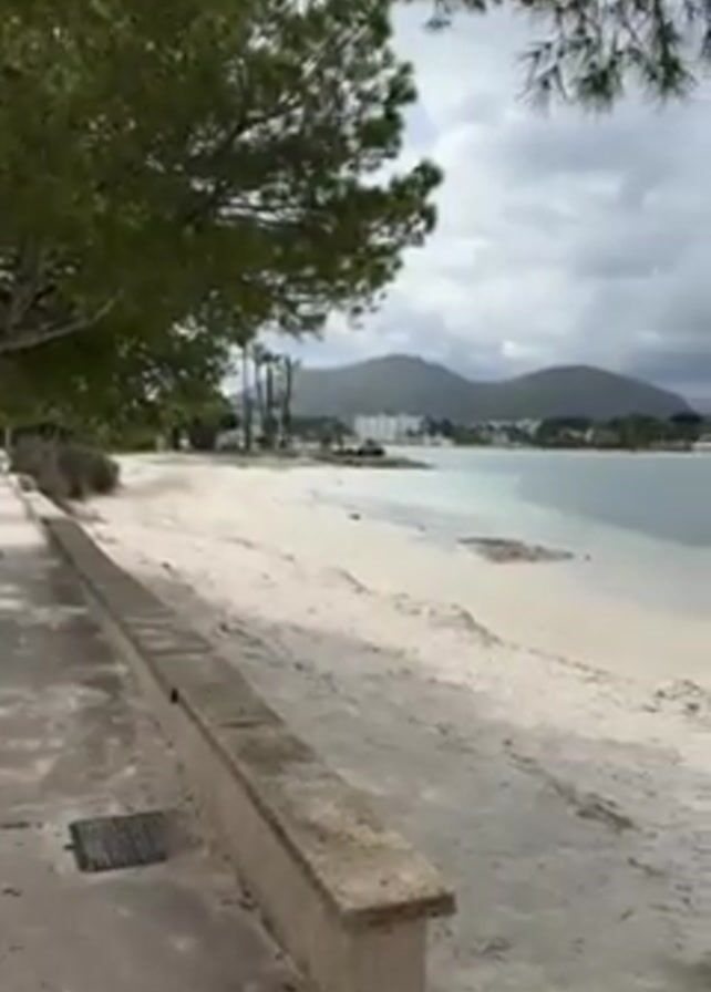 beach scene with a cloudy sky overhead. The beach has white sand and calm, light blue water. In the background, there are green hills or mountains. A paved walkway runs alongside the beach, separated by a low, stone wall. Trees with green foliage are visible along the walkway. Several boats, including rowboats and kayaks, are on the sand near the water's edge. There are buildings visible in the distance on the other side of the water. The camera slowly pans to the right along the beach.