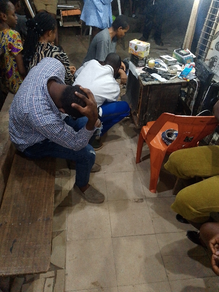 The image depicts an indoor scene in Egbagu, Nigeria, consistent with an informal electronics repair shop or waiting area, under dim artificial lighting