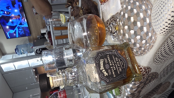 The scene depicts an indoor setting, likely a dining or living area, in the city of Chirpan, Bulgaria. A table is covered with a patterned tablecloth featuring geometric shapes. On the table, a clear glass bottle of Jack Daniel's Single Barrel Select Tennessee Whiskey, 70cl, 45% Vol., is prominently displayed, partially consumed. Adjacent to it is a snifter glass containing an amber liquid, presumably whiskey. Three additional clear drinking glasses are present, one holding a yellow lemon slice. A red-labeled plastic bottle of Coca-Cola is visible to the left. A white plate on the right holds several dark, irregular-shaped food items, appearing to be fried or roasted meat. A small, shiny silver-foil wrapped object is also on the table. In the background, grey kitchen cabinets with glass doors are visible. A water cooler with a large blue water bottle sits on a countertop. A flat-screen television mounted on a wall displays a close-up image of a female face with dark hair, illuminated by blue light. A human arm and hand are partially visible in the upper right quadrant of the image, positioned near the table setup.
