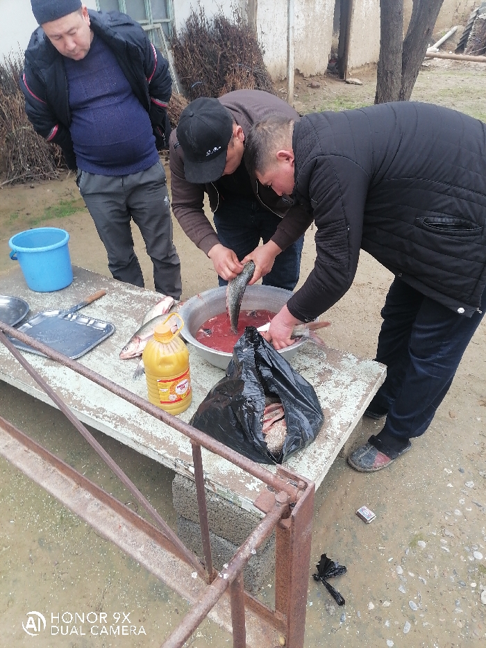 - "Three men are outdoors cleaning fish on a concrete table" by FM-NK6PE2, licensed under CC BY 4.0