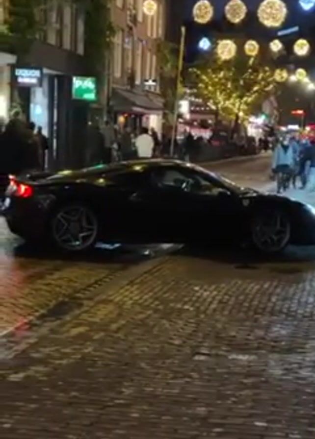 dark-colored Ferrari 458 parked on a cobblestone street at night. Several people are walking along the street in the background, and buildings line both sides of the road. The street is lit by streetlights and decorative string lights hanging overhead. There are stores and restaurants along the street, and it appears to be a busy area with pedestrian traffic. The car is stationary and no one is interacting with it. The camera is also stationary.