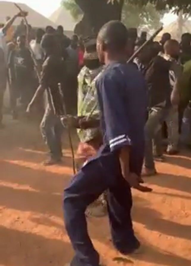A group of people, likely at a festival or cultural event, are gathered in an outdoor area with a dirt ground. The central figure is wearing a traditional costume, including a full-body covering with a woven mask and a patterned yellow skirt. The person moves with a cane. The crowd, consisting of both men and women, are surrounding and watching the costumed person, with some appearing to dance or move to the rhythm of the unseen music. The surrounding environment includes trees and what appear to be tents or buildings in the background, suggesting the event is taking place in a village.