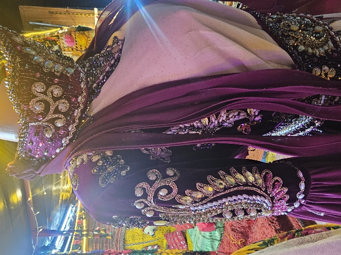 A close-up view showcases a richly embellished garment, primarily in deep purple
