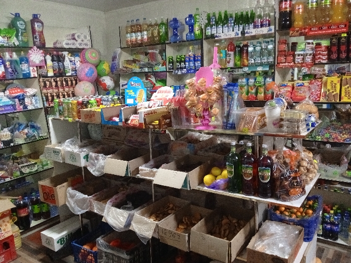A vibrant small shop overflows with goods on shelves and displays. Glass shelves showcase drinks, household items, and toys. Below, open boxes contain dried fruits, nuts, and snacks. Three bottles stand among lemons. A blue crate holds oranges. Candy on sticks draws the eye, adding to the general impression of a well-stocked, bustling store.