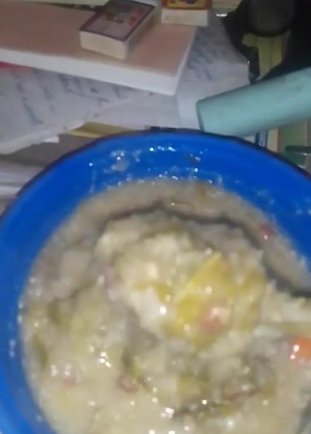close-up of a blue plastic bowl containing a thick, watery mixture of food. The food appears to contain various ingredients, including what looks like vegetables (some with an orange tint) and other unidentified items. The mixture appears light brown or tan in color. A spoon is used to lift a portion of the mixture out of the bowl, then returned. The bowl rests on a desk or table covered with papers, a matchbox, and other small items. The lighting in the video is somewhat poor.