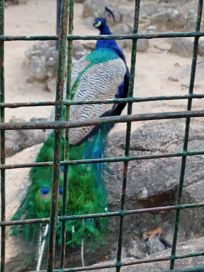 - "A peacock stands behind a weathered, dark green metal grid fence" by FM-IkfyG2, licensed under CC BY 4.0