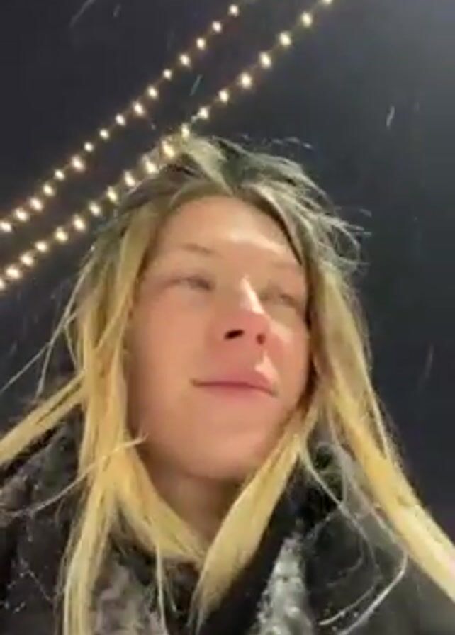 A young woman with fair skin, blonde-streaked hair, and blue eyes is looking up at the camera as snow falls around her
